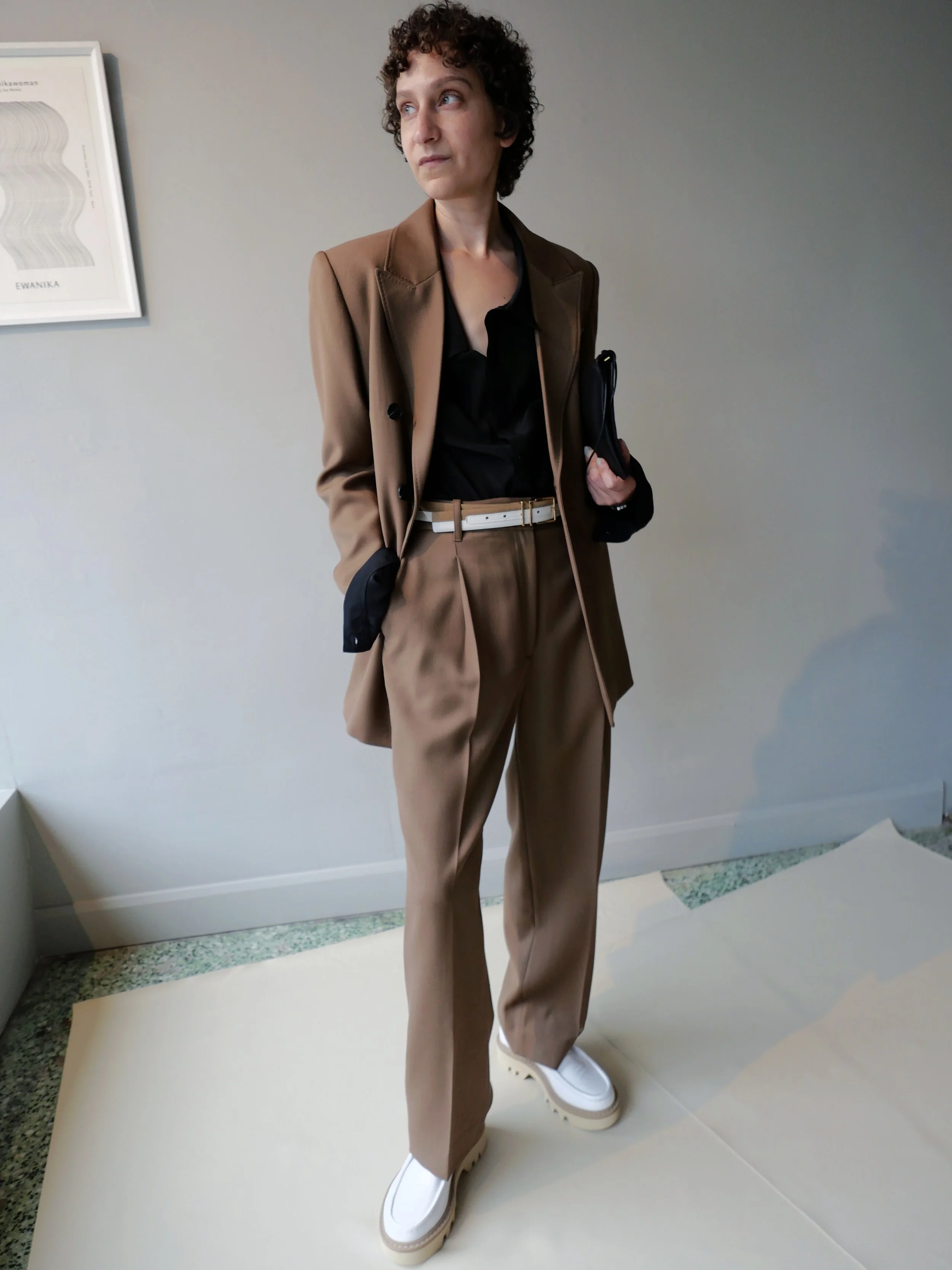 ABOVE, WE HAVE SOFIE D’HOORE . . . CARMINA JACKET, PINOT TROUSER, AND THE NEXICO V-NECK SWEATER WRAPPED AROUND THE LEMAIRE POINTED COLLAR SHIRT. FINISHED WITH THE SOFIE D’HOORE FALCONE WALLABEE, WINTER SHOES WITH AN INCREDIBLE VIBRAM GRIP, AVAILABLE IN WHITE AND CHOCOLATE BROWN.