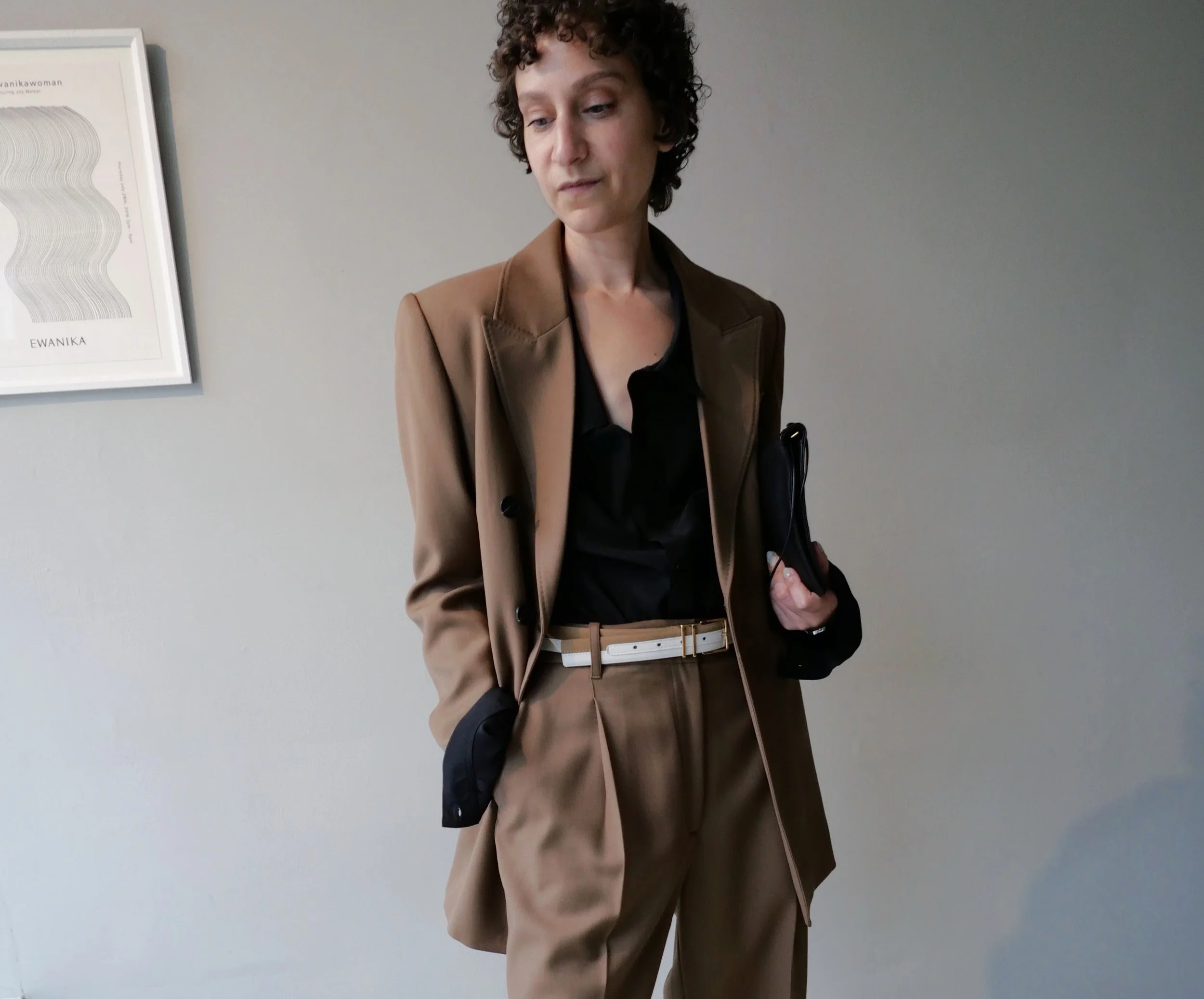 BELOW, THE A.EMERY BLAZER DOING DOUBLETIME WITH A DAWEI HOUNDSTOOTH SKIRT, STRIPE BLOUSE, TSTATSAS AMOS SMALL SHOULDER BAG AND MKDT STUDIO BOOTS.